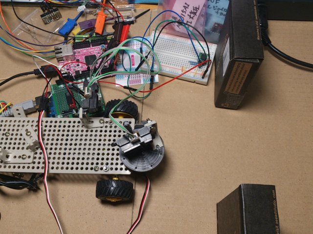 当初、動かすのが速すぎて、距離がうまく取れませんでした。GP2D12のデータシートを見たら、ちゃんと、最大50msほど測定にかかると書いてありました。そこで、一点で停止→100ms待ち→測定→次の点へを繰り返すようにしました。